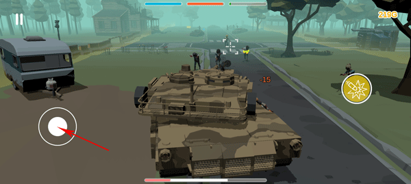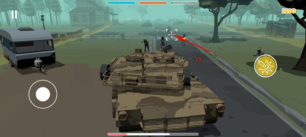 操作上也很简单,左下角是方向盘用来控制方向,中间拖动可以瞄准,右下角按钮射击。刚开始玩的时候我还得慢慢适应丧尸的攻击模式,但一旦找到节奏就变得超刺激了。特别是开着坦克碾压丧尸的时候,那种快感简直无法形容。