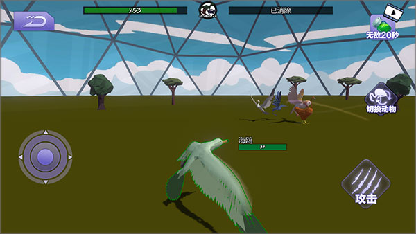 1、下载安装好游戏,进入游戏,使用左边的轮盘来控制角色移动,点击右边的按钮进行攻击,点击右侧的切换动物可以控制其他动物进行游戏。将场上除你之外的所有敌人消灭即可获取胜利。