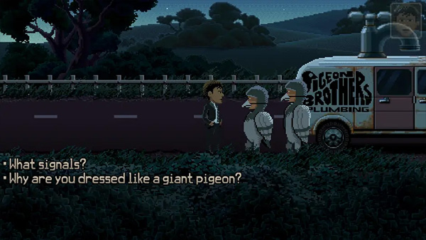 沿着公路一直走,会遇到名为鸽子兄弟的电气维修公司,简短对话后,进入镇上