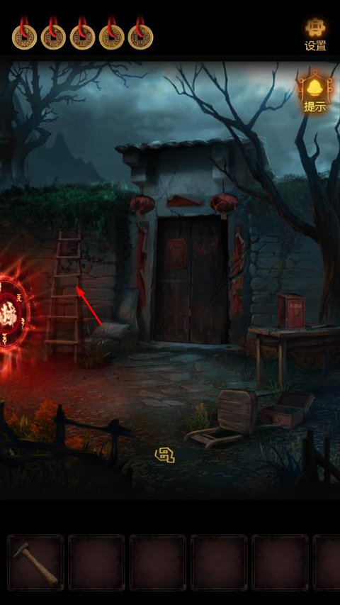 4、点击梯子上的院墙,使用【锤子】将玻璃击碎,活动【玻璃碎片】。