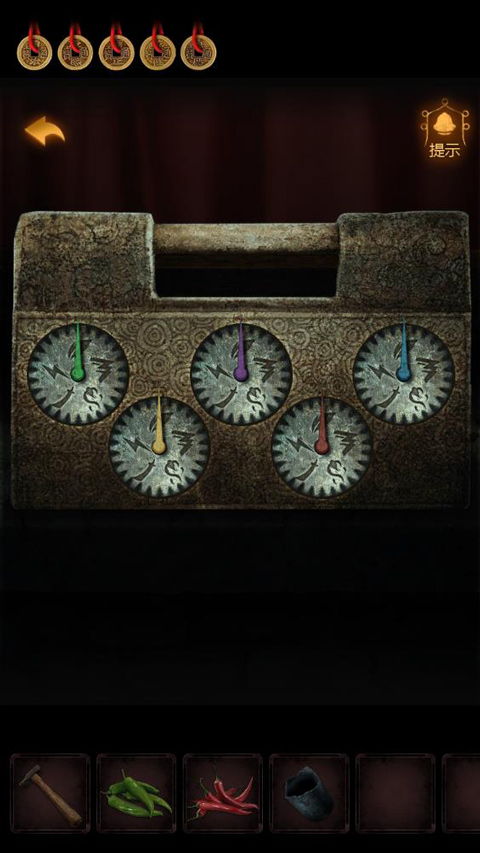 15、对照灯笼上的图案,打开右边桌子上的小盒子,获得【金属手镯】。