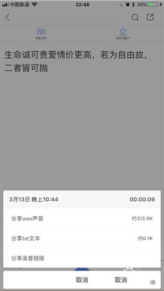 5、点击分享图标可将录音生成为wav声音、txt文本、录音连接保存与分享