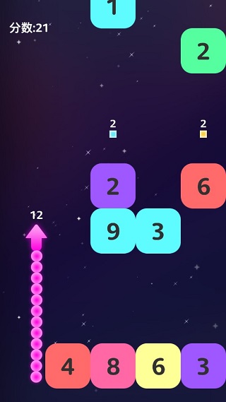 控制箭头顶向带有数字的砖块,砖块上显示数字越小对你的伤害就越低你的尾巴就会越长,同时你还可以吃到沿途的能量点来增加自己的长度,当然各种各样神奇的道具会让你一爽到底,吃的能量越多坚持时间越长得分越高,获得的金币就越多。