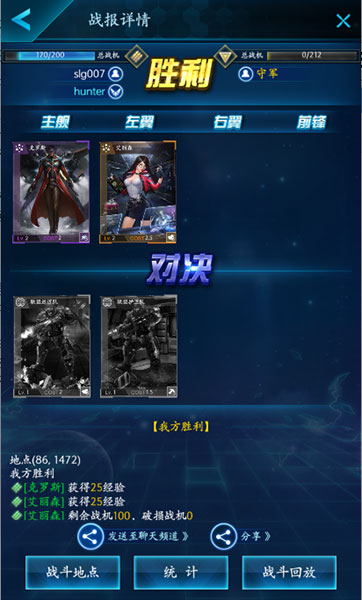 4、战斗结果显示,胜利并占据星区。舰队到达目的地就会马上开始战斗,如果双方实力相差悬殊,战斗会马上结束,己方胜利就可将目的地占据,失败就会损失较多兵力,而无论胜负,英雄都可获得经验。如果对战双方8回合内势均力敌,那么舰队会返航,星区还是未占领状态。战败或者打平,守军损失的兵力在20分钟内不会回复,此时可以跟进2队或者主力在回复时间内到达该星区,扫荡残军,就有更大几率获取战斗胜利。