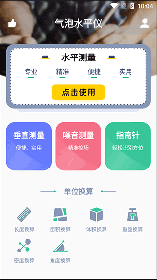 水平仪测量app是一款用于测量角度和表面水平程度的实用工具,该软件简单便捷,有垂直测量、噪音测量和指南针的功能,单位换算支持长度、面积、体积、重量、密度、角度的换算。水平仪测量app首页便能看出软件的全部功能,在这里,你可以对您想要测量的物体进行各种测量,软件还支持各种换算,用起来还是很好的,需要用到这一方面的朋友们赶紧来下载以便更深入了解这款软件吧!