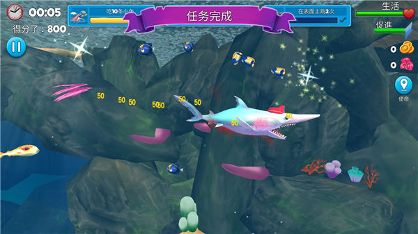 2、各种鲨鱼升级狩猎和生存,玩家们能够让自己的鲨鱼在游戏中得到全面的进化;