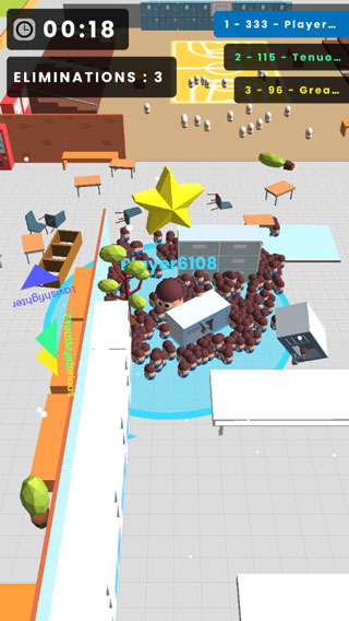 总体来说,源自于传统的IO类游戏,其玩法上都是那么的千篇一律,以争第一为目标。而这里的玩法更加的简单以上,在2分钟限定的时间内,通过招募、收揽更多的人群让自己的阵容更加强大为目标,期间随着人数的增加,力量的雄厚可推翻前方一切障碍,什么挡板啊,教师墙壁都是浮云,但这里的前提是你所汇隆的人数基数够大,当然了除了去各个地方招募收揽一些空白、没有站队的人物以外,其他比你弱小的人群无疑也是走向强大的关键所在,所以赶快来试试吧!