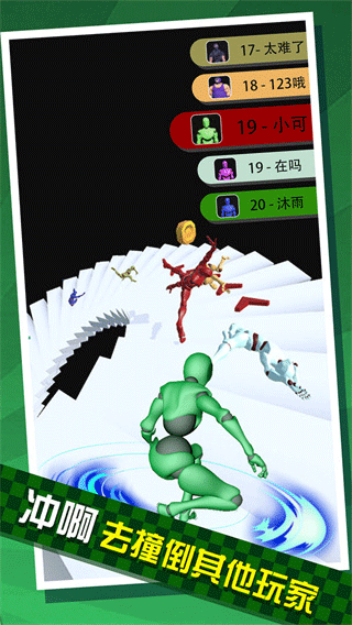 《给我滚下去》是一款超级有趣的休闲闯关游戏,玩法简单又魔性。你操控一个软萌的橡皮人,在充满弯路的楼梯上滚动,通过左右滑动手指控制方向,避免掉下去。游戏里可以和其他玩家互动,把他们撞出楼梯或者自己飞出去找捷径,赢了就能解锁新皮肤。画面清爽,音乐也很棒,让人玩起来停不下来。