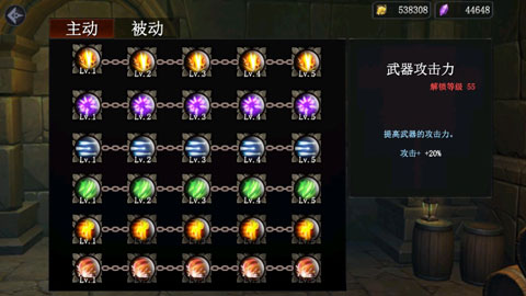其中主动以五种技能为主,每个技能分为5个等级。