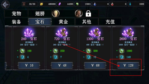 1、进入游戏后,先打开商店,选择购买宝石,这时你会发现钻石(宝石)以及其他石头没有增加,别担心只是没有显示,确实是已经购买了的。