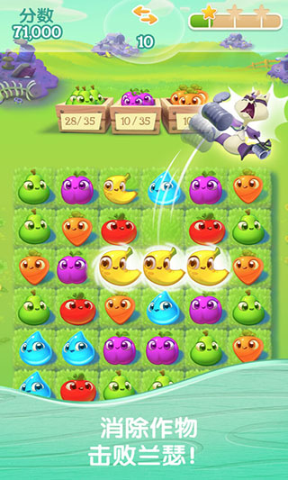 农场超级传奇游戏是一款非常有趣的消除类手游,界面设计萌萌哒,颜色清新,蔬菜水果都画得很可爱,特别是他们大眼睛的样子简直让人忍不住想保护它们!玩法主要是三消换位,按住屏幕上的蔬菜和旁边的交换位置,三个或以上相同作物就能消除,四个及以上还能变异加分,听起来挺简单的,但玩起来还是有点挑战性的。