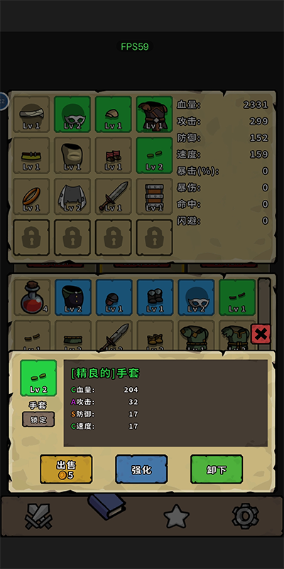4、在点击下方的【装备】图标,进入【装备】页面,玩家也可对装备强化和出售,来提升角色的能力,这样能闯过更多关卡