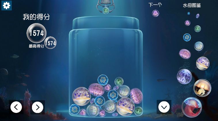 1,放置水母:游戏中会不断掉落各种大小的水母。你需要点击或拖动屏幕,将这些水母放置到游戏区域中。