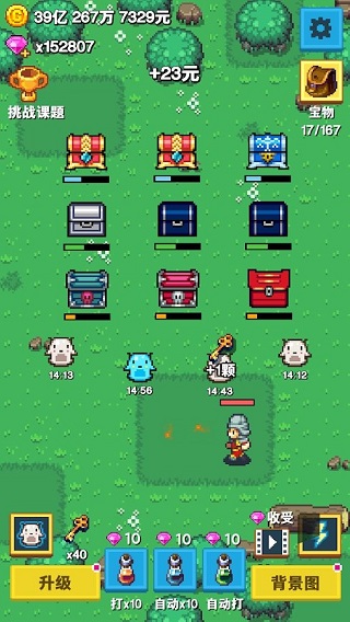 3、点击路人可以收集宝物,这些宝物也可以帮你升级宝箱的,同时游戏有多种背景,玩家可以慢慢的进行解锁!