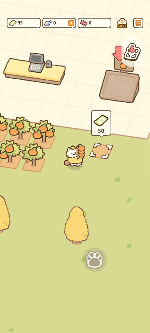 4、有了货架后,你需要先移动至果树位置摘水果再将水果运到货架中,有了足够的数量才能让客人进行购买。