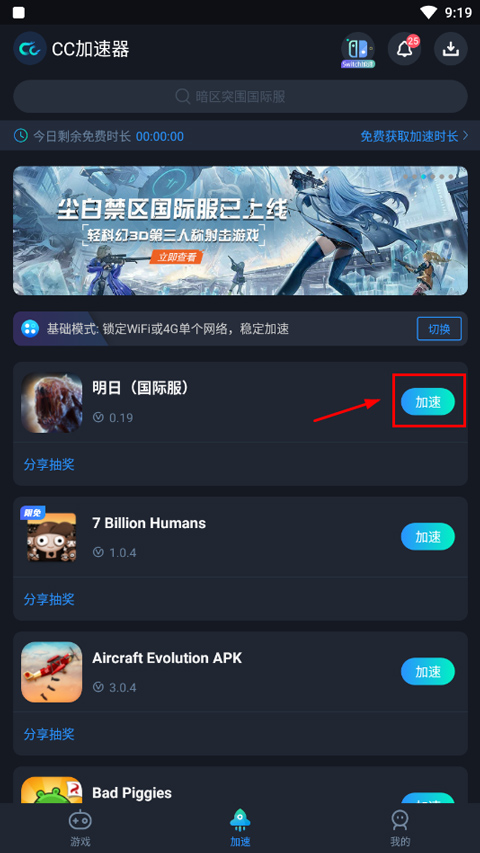1、在本站下载安装明日手游,游戏需加速器启动,打开CC加速器,找到该游戏,点击右侧加速;