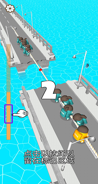 左方能量槽为根据玩家的点击评率变化,玩家需要控制黄色能量槽在紫色框所选位置,否则操控的队伍会不断被拉扯进水里