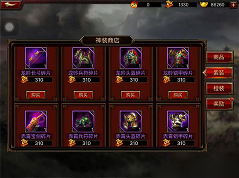 紫色装备碎片获取途径为主线副本以及三国无双中的神装商店: