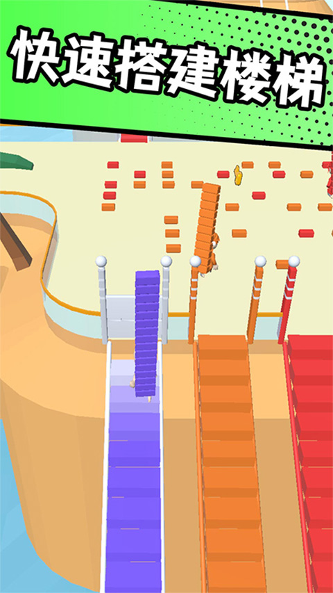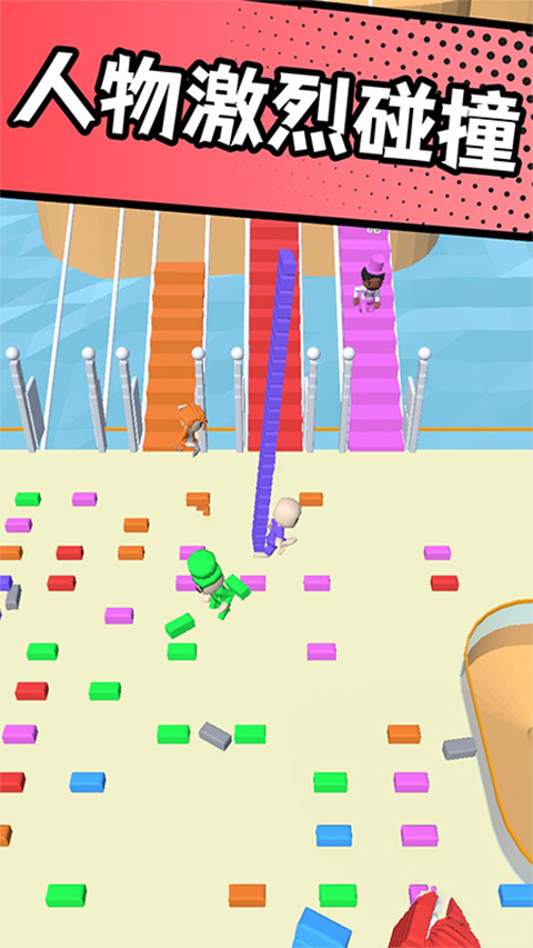 2、用收集的砖块来搭桥到达下一个平台,同时还要保证不能让别人攻占你的桥梁,你可以选择一次性收集足够的砖块来打造好桥,最先到达终点即可获取胜利。