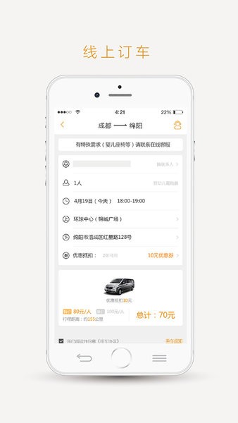 线上订车:会显示您的订单信息,如乘车人数、支付金额、时间、地点等信息,保障您的出行服务;