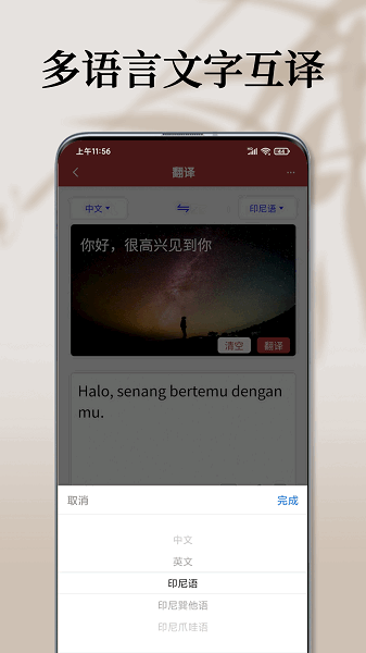 智能识别图片中的文字,无论是菜单、路牌、商品说明、景点说明等文字,都可以上传或者拍照并自动识别成文字,并一键翻译成中文或印尼文,即使身处国外也能告别文字障碍,快速了解和熟悉环境。