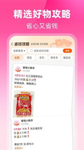 全网优惠整合:接入淘宝、天猫、京东、拼多多、唯品会等国内外知名电商平台的海量优惠券,一站式解决用户的购物需求。