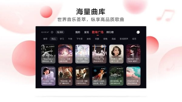 功能方面,网易云音乐TV版延续了其一贯的精美设计,比如黑胶美学界面让人耳目一新。还有氛围空间功能,提供了多种主题场景音效,特别适合放松心情或者冥想。动效设计也很酷炫,播放音乐时屏幕会有动态效果,看起来很有高级感。