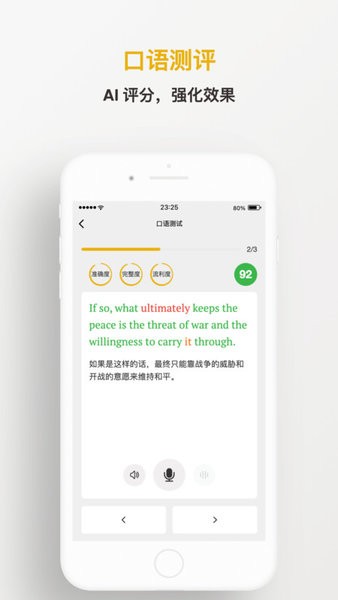 利用AI技术对用户的口语进行测评,从完整度、流利度、准确度等多个维度进行准确评估,并给出反馈和建议,帮助用户检验学习成果,提升口语水平。