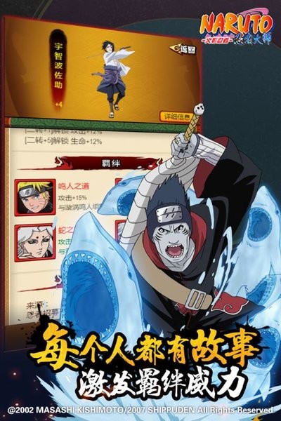 《火影忍者》官方正版授权手游――《火影忍者-忍者大师》强势来袭!漫画的连载已完结,羁绊仍持续!火の意志,由你继承!游戏完美再现原着剧情,原汁原味引爆动漫经典;动画原着人物悉数登场,带你回到最初的感动; 禁术仙术究极忍术,由你操控;影级神级巅峰级忍者由你招募自由组合,打造最强阵容;血统感情种种羁绊助阵,探索忍界奥秘;原着品质画面,极致还原火影忍者世界,忍者大师之路等你加入!
