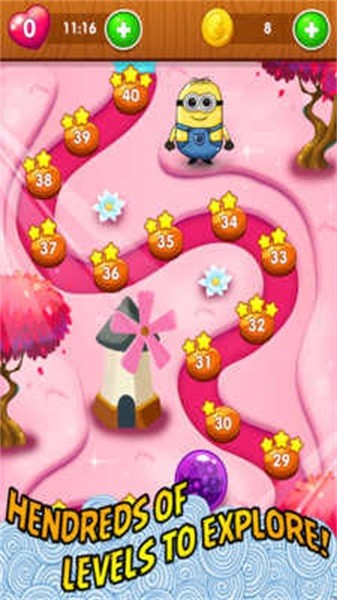 在史诗人物的小黄人游戏中,你必须使用弹弓来配合和爆破彩色泡泡球。