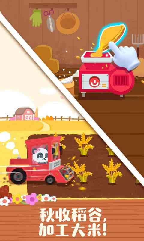 “春播种,秋丰收”,秋天是收获的季节哦。驾驶农耕机,收割稻谷,平铺晾晒,再放进机器中加工。瞧,一粒粒稻谷变身成了大米!宝宝学会了吗?快帮农民伯伯一起收割粮食吧。