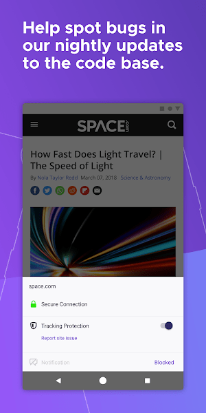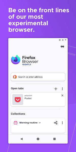 旨在展示更多实验性的 Firefox 版本。夜间频道允许用户在不稳定的环境中体验最新的Firefox创新,并提供关于功能和性能的反馈意见,以帮助确定什么使最终版本。