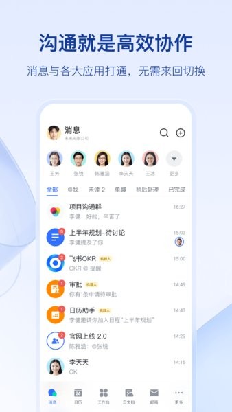 一站式无缝办公协作,团队上下对齐目标,全面激活组织和个人。飞书,定义先进团队的工作方式,“无缝打通”即时沟通、视频会议、日历、云文档、OKR等强大功能与开放应用,彻底告别零散的多套系统和割裂的协作体验!