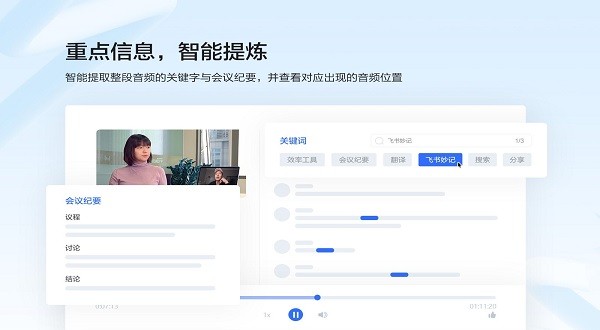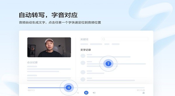 智能提取整段音频的关键字与会议纪要,并查看对应出现的音频位置。