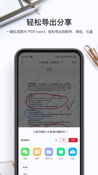 口袋扫描仪可以把文件直接转换成PDF格式或者是图片的格式,一键转换并导出到本地或者分享,还支持分享文件链接,方便您和朋友共享。
