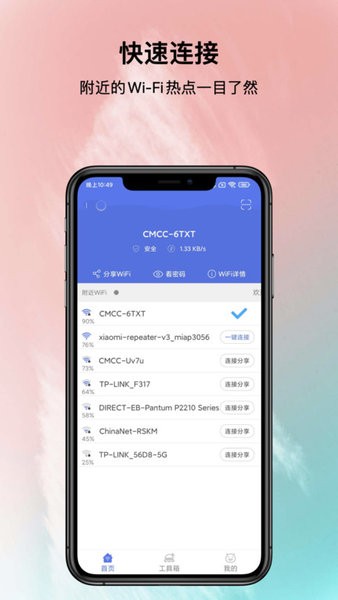 1.一款免费的wifi上网工具,让你轻松方便连接wifi,适合在外奔波的商务人士、网络达人