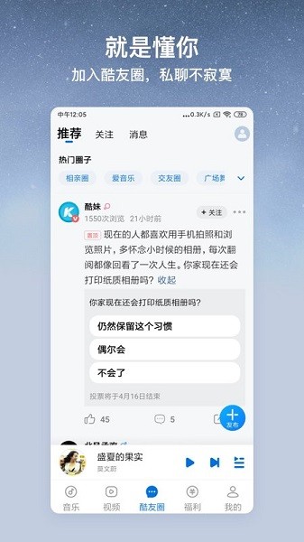 音乐交友、美食分享、观点讨论,茫茫人海,在酷友圈找到知音不寂寞。