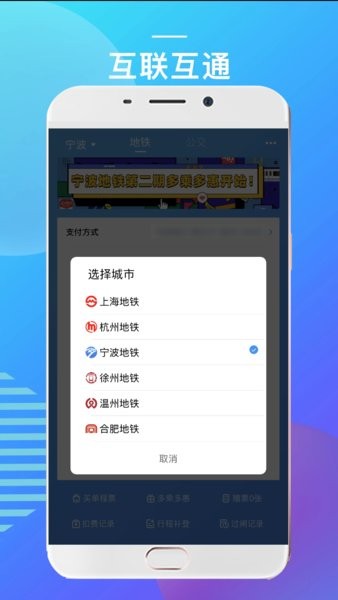 3.0.22及以上版本支持互联互通功能,在二维码乘车页面选择切换城市,可在上海地铁扫码过闸。