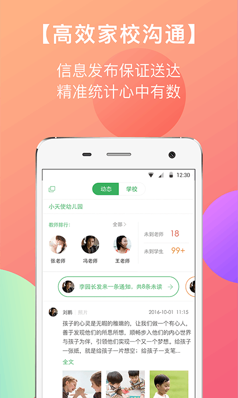 东电微校教师端app是一款面向旗下教师群体量身打造的线上幼教平台,可以一键快速发布最新的通知消息,实时发布学生在校的动态,观看课堂视频,教学状态一手掌握,还可以与家长随时沟通,展示学生每日分食谱,方便家长了解,提高教学的效率!