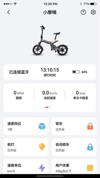 电量、里程、骑行时间、踏频、速度档位、锁车、前灯、自动锁车、速度单位、助力等级、用户体重、电子刹车、健身路线、自动前灯、自动亮度、数据清零、来电提醒等;