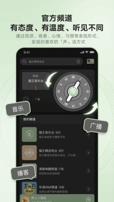 具有电台文化传承的创新聆听方式。在这里,不管是学习、工作还是休闲放松,想听古典、爵士还是嘻哈,都可以把你的兴趣、爱好“装进”「频道」里。