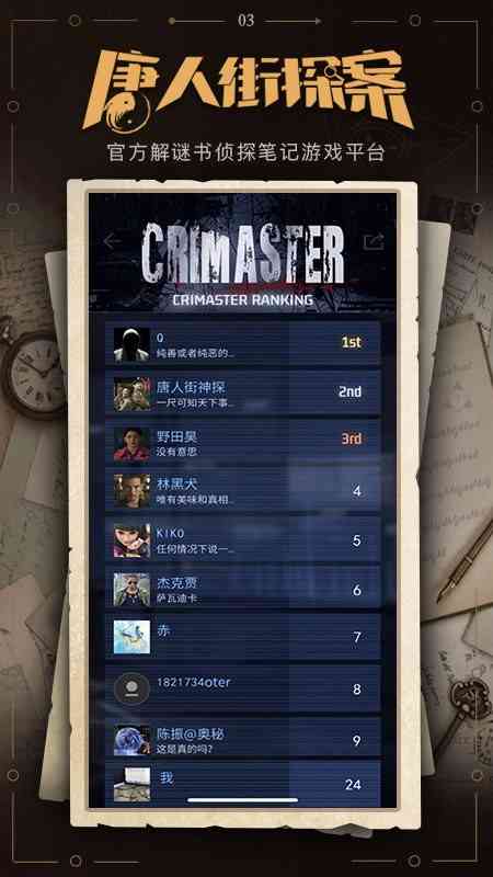 电影《唐人街探案2》的官方创意侦探解谜游戏,也是一本精美的随身笔记。笔记本的封面、页码、涂鸦、符号都隐藏着案件信息,还有神秘线人在游戏中通过crimaster与你联系,要破解层层谜题,你还需从现实中找寻线索,进而侦破案件、找到真相!
