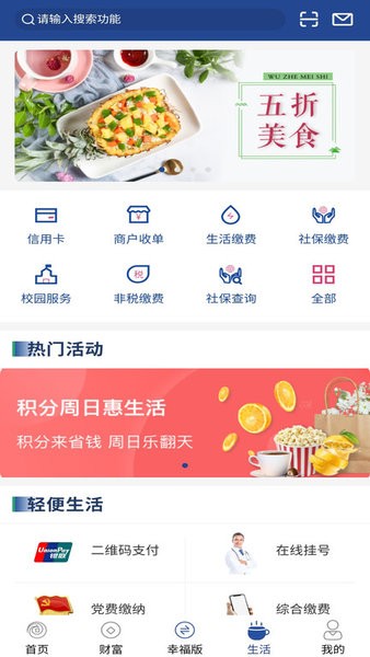 5.生活:提供生活缴费、社保缴费、话费充值等各类便民服务。