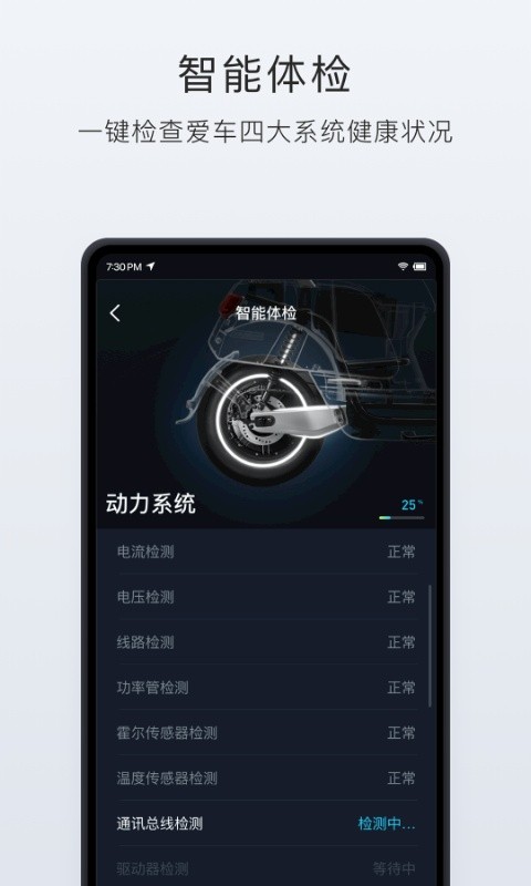 车况:电量和预估里程、安防定位、远程操控、智能体检、历史轨迹、骑行统计、附属智能设备;