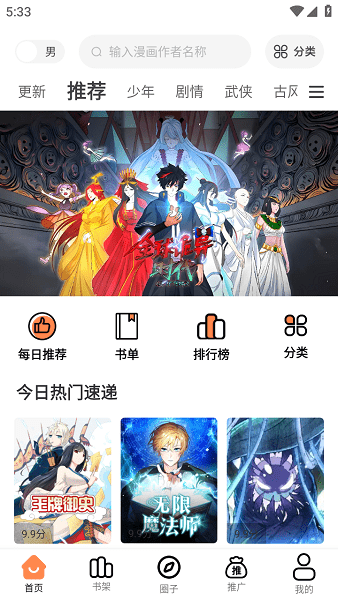 拥有庞大的漫画库,涵盖国内外热门、经典漫画作品,包括日漫、国漫、韩漫等。漫画按类型、地区、热度等多维度分类,还设有新书榜、好评榜等榜单,方便用户快速找到心仪作品。此外,平台与漫画源头同步更新,能让用户第一时间读到最新章节。