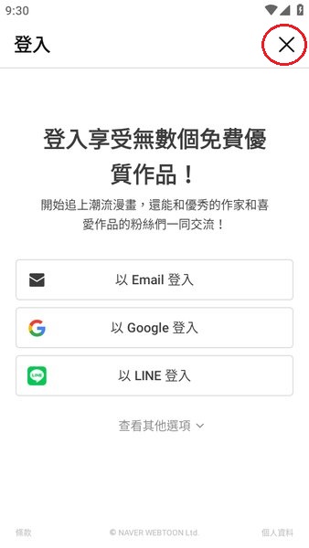 如果只是想看一会漫画的朋友,可以不用登入,直接在登录界面点击右上角的“X”号,就可以进入软件了,但是只能看漫画,很多其他功能用不了。