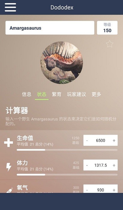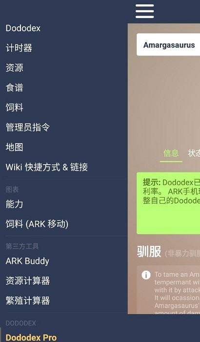 dododex安卓版生存进化中的每种生物提供一个综合全面以及经常保持更新的指南手册,其中包含驯服计算器、饲料和鞍的配方、生物属性、计时器、每种武器的击晕效果信息、以及独创的提示和从成千上万的ARK玩家中收集到的大数据信息。