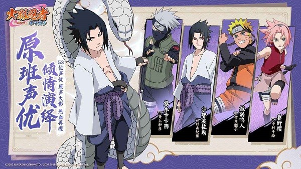 竹内顺子(鸣人)、杉山纪彰(佐助)等53位知名声优倾情加盟,为游戏中的特定角色配音,再度演绎那些耳熟能详的经典角色。让每一次对话、每一场战斗都充满沉浸式的听觉享受。无论是悠闲的放置时光,还是紧张刺激的战斗瞬间,都能让你仿佛置身于真实的火影世界,声临其境地感受忍者的热血与激情。