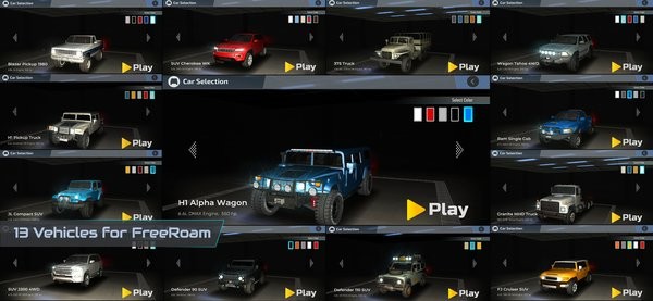 13 种不同的越野车辆,具有逼真的悬挂和越野功能