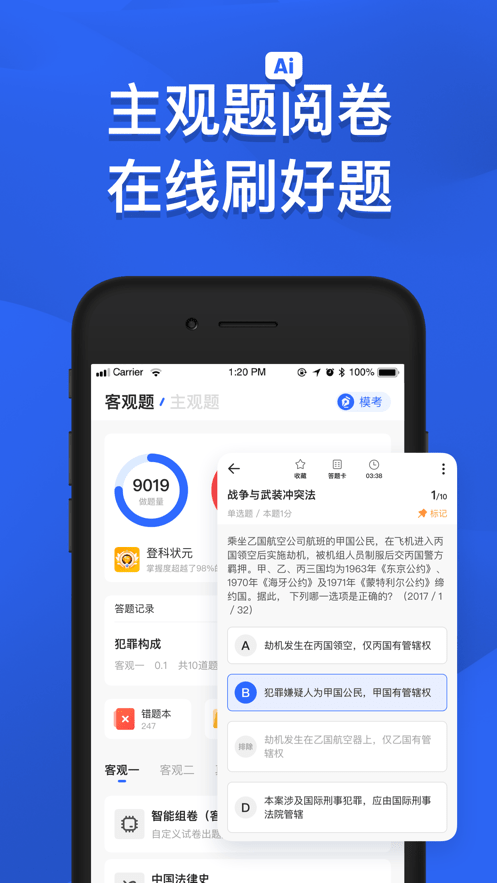 app 的主要功能挺多的,比如说有各个科目的专业课程,像刑法、民法这些重点科目都有名师讲解,感觉学起来轻松多了。还有 AI 阅卷的功能,主观题也能在线练习,及时知道对错,这个设计挺实用的。